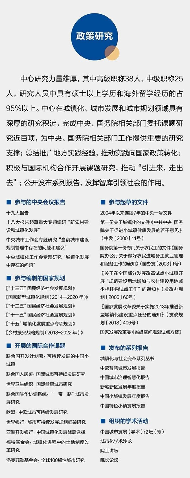 中国城市和小城镇改革发展中心,成立于1998年,主要承担城镇化、城市发展、城乡融合及相关领域的政策研究和决策咨询工作,为中央、国务院相关政策文件制定和规划编制提供研究支撑,为全国城市和小城镇发展提供政策咨询服务,为全国城市和小城镇发展编制各类规划,为城市间国际合作、智慧城市建设、城镇化新媒体宣传推广、文化体育交流、城市多样化融资搭建专门平台,是专注于城镇化、城市发展和城市规划问题的高端智库。